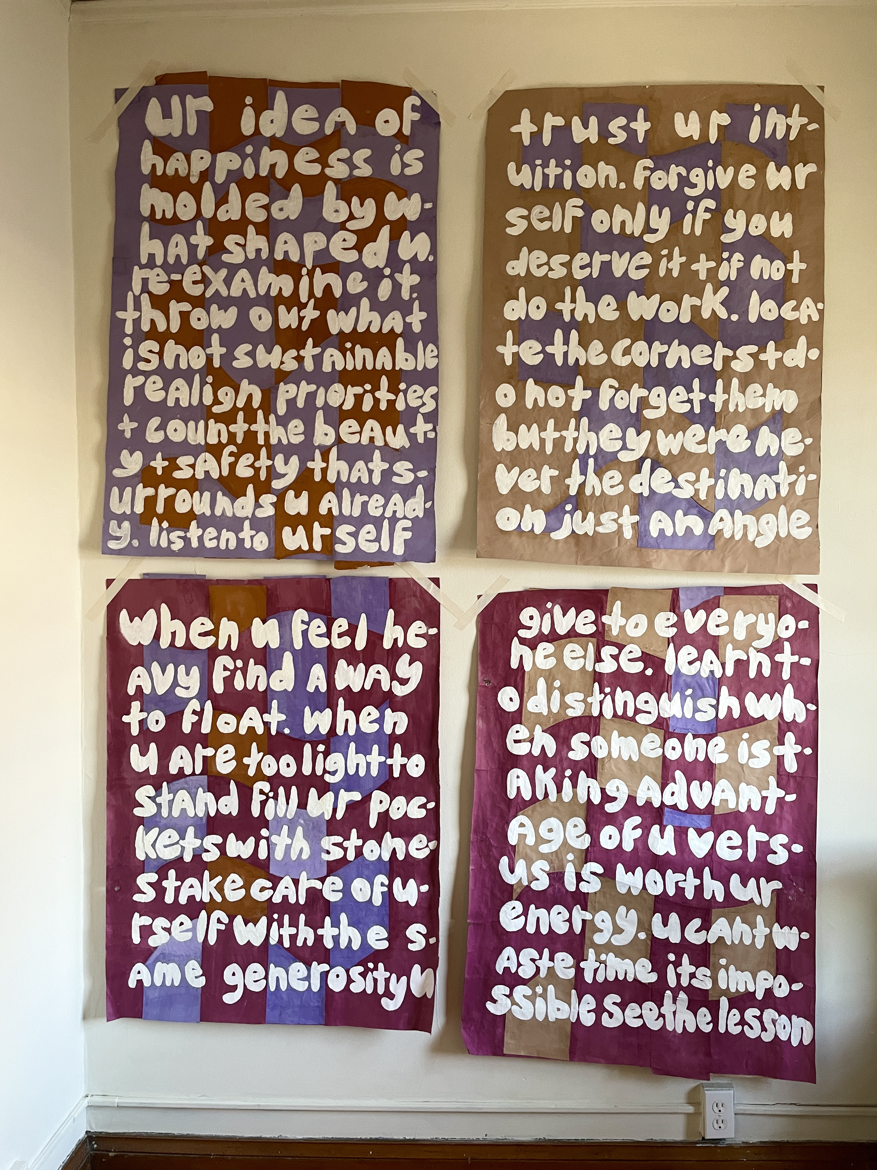 Self Affirmations from the Disgraced Mayors dumpster, woven paper, gouache, mod podge. 2021