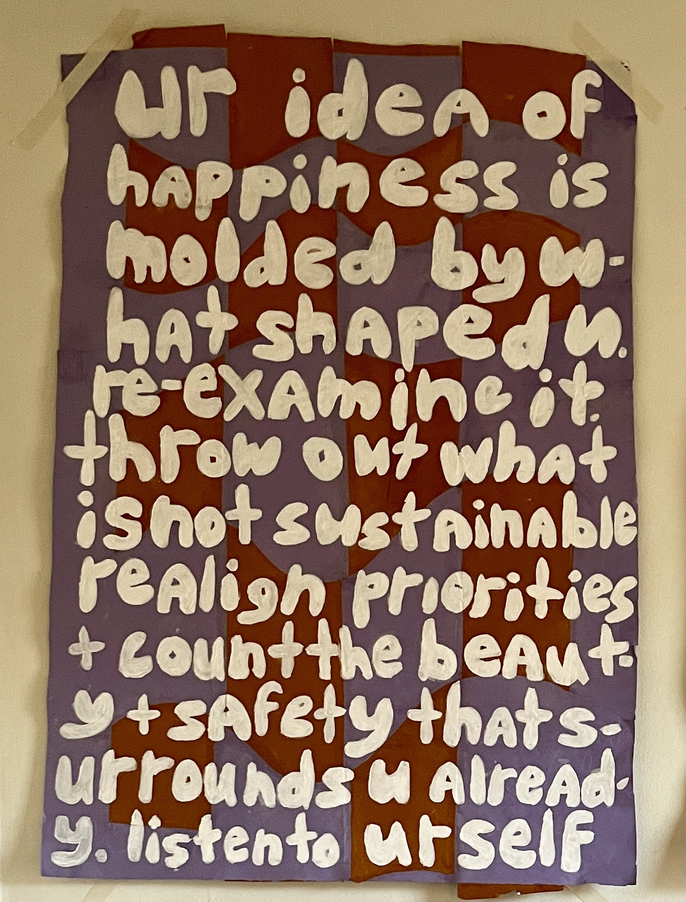 Text:ur idea of happiness is molded by w-hat shaped u. re-examine it. throw out what is not sustainable. realign priorities + count the beauty + safety that s-urrounds u alread-y. listen to urself. trust ur intuition. forgive urself only if you deserve it + if not do the work. locate the corners + d-o not forget them but they were ne-ver the destinati-on just an angle. when u feel heavy find a way to float. when u are too light to stand fill ur poc-kets with stone-s. take care of u-rself with the s-ame generosity u give to everyo-ne else. learn t-o distinguish wh-en someone is t-aking advant-age of u vers-us is worth ur energy. u cant w-aste time its impo-ssible seethe lesson.